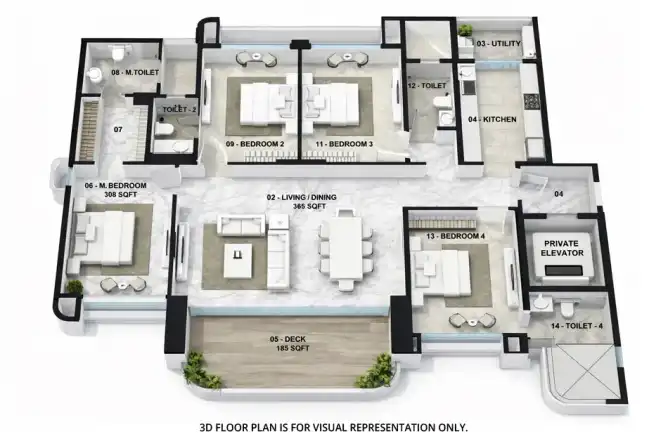 • Lavish 3 BHK and 4 BHK apartments along with a wide terrace-like deck.