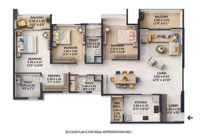 Carpet area varies between 761 sq. ft. and 1, 750 sq. ft., depending on the arrangement.